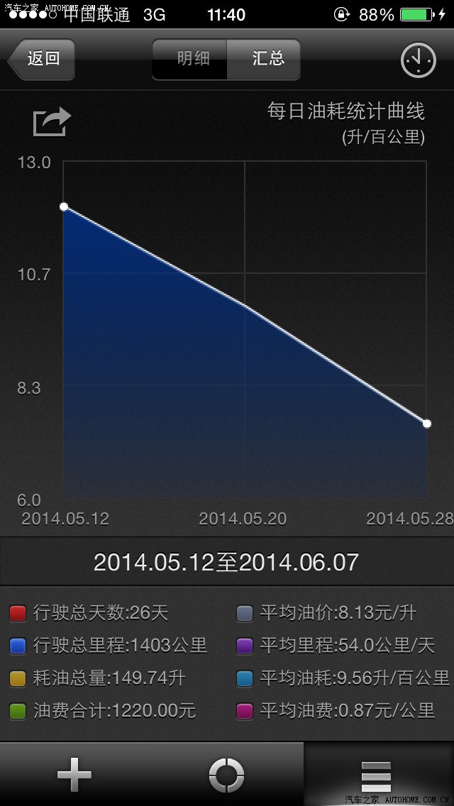 油耗我个人还是能够接受的,到现在为止跑了1400公里了。加了1200块的油钱,其中70%的市内,20%的郊区,10%的高速,等下上图给大家看。