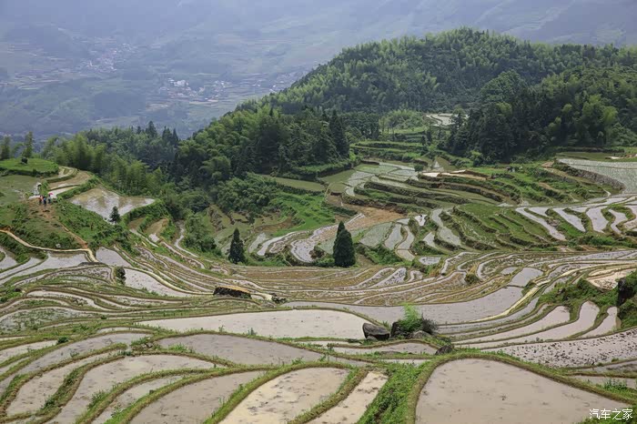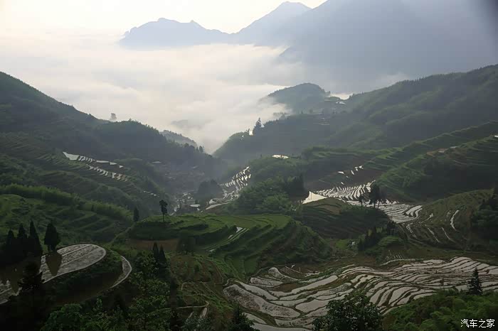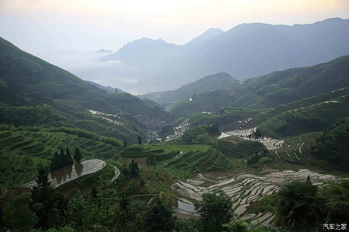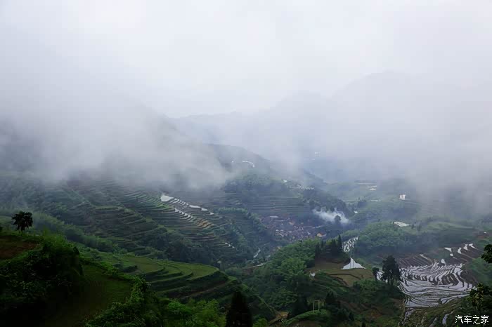 。一进入景区就是一个很大的观景平台。时间已经快5点半了,此时却没有了昨晚的运气。太阳其实早已经爬上山头,但被厚厚的云层遮挡,无法一睹真颜。从观景平台俯首下望,是广袤的层层梯田和点缀其间的农庄。由于今晨谷底没有太多水汽生成聚集,因此也就没有看见传说中的梯田和农庄被云雾缭绕,宛如仙境的奇观----运气有点背
