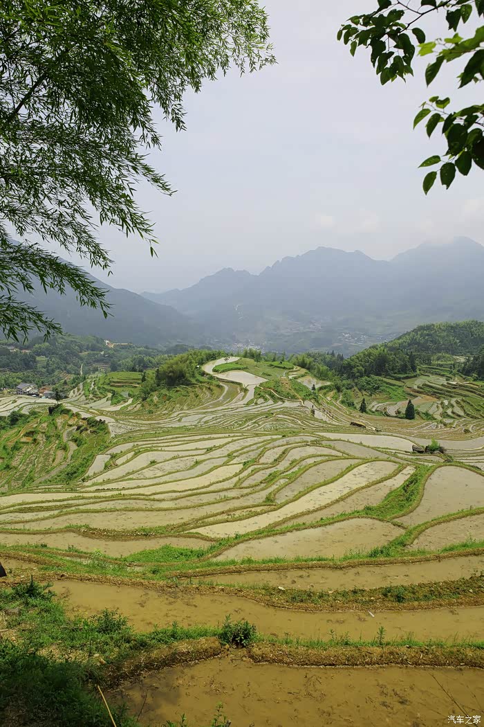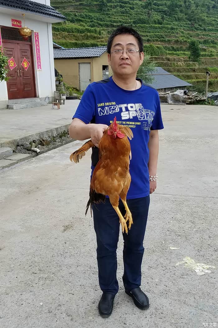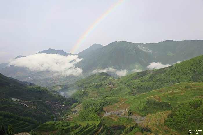 。农家乐店家阿姨帮我们安顿好后,首先去安排晚餐的主菜,跟随阿姨下坡去鸡棚抓鸡。农村人不愿意轻易吃母鸡,因为要留着下蛋,于是捉了只3斤8两的半大公鸡交给阿姨去整治。刚把今晚的主菜安排好,正准备去七星墩看梯田,天空突然毫无预兆地洒下了瓢泼大雨。只好暂停计划,此时店家主人,60多岁的老伯也回来了。于是坐在门口的雨棚下与店家夫妻俩有一搭没一搭地闲聊着,等着大雨的停歇。山区的天犹如娃娃的脸,忽晴忽雨变化无常。转眼大雨戛然而止,惊喜地发现一道彩虹在空中划过一个完美的半圆蓦然而现在天边。一瞬间,众多游客蜂拥至七星墩观景台,端着长枪短炮对着彩虹和雨后初晴的山谷梯田好不吝啬地消费着快门。拍得心满意足地回到农家乐,店家阿姨已将美味佳肴整治完毕,摆上了门口的小桌。鲜美的鸡汤和香喷喷的红烧鸡块,清炒自家地里种的碧绿生青小青菜,糖醋藠头,云和豆腐蘸土制辣酱,还有一种叫不出名的黑乎乎像豆干一样的食材和辣椒一起爆炒,嚼在口里非常劲道。坐在农家小院,喝着小酒,品尝着美味,欣赏着周边宁静安逸的乡村野景,实在是另一种心满意足。今天的心满意足来得太频繁