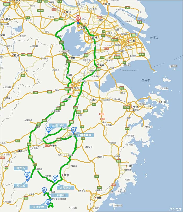 。于是放弃北行计划,把视线转向南方。离我们不远的邻省浙江是个旅游资源及其丰富的省份呀。以前只去过浙北、浙东和浙西地区,浙南地区还从未涉足。目光随即聚焦到了浙南地区的丽水。丽水,古称处州,浙江省辖陆地面积最大的地级市;地理位于浙江省西南部。地势以中山、丘陵地貌为主,由西南向东北倾斜。丽水被誉为“浙江绿谷”。境内海拔1000米以上的山峰有3573座。龙泉市凤阳山黄茅尖海拔1929米,庆元县百山祖海拔1856.7米,分别为浙江省第一、第二高峰。生态环境质量浙江省第一、中国前列,生态环境质量公众满意度继续位居浙江省首位。对外开放旅游点68个,其中国家AAAA级旅游景区12家。此次旅行共计3人:LD和我,以及好友X君。本来准备5号出发,10号返程,在外6天,然后前后各留1天作准备和休整。由于X君的缘故,推迟到6号出发,行程压缩至5天。然而要想在短短的5天内遍游一个丽水市的12个4A级景区是不可能的,何况我们此次出游的定位是以休闲放松为主。因此决定选择几个网上评价较好的目的地:遂昌县南尖岩,神龙谷;景宁县云中大漈,云和县云和梯田,莲都区古堰画乡;X君爱好工艺木雕,最后再加上个金华东阳,参观闻名全国的中国木雕城。