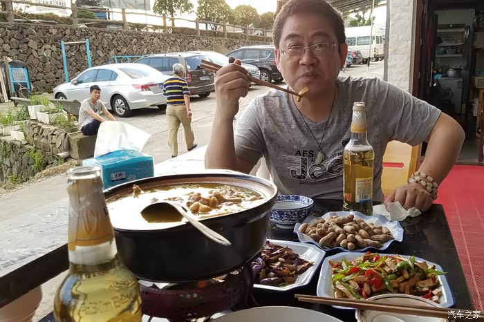 。后来的事情也证明了那段时间内整个景区确实只有我们3个游客。由于景区呈一字长廊形,入口和出口分别在景区的两端。处于安全考虑,游客进入景区时,入口会把游客人数通知出口。景区必须确保有多少游客进入,就要有多少游客出来。当我们游览到大约一半路程时,前面有位景区工作人员迎了上来,一问才知出口处显示景区内只剩下我们3位游客了,工作人员是来找寻我们并将我们领至出口处,这才放心下班。由于我们的汽车停在入口处停车场,还需搭景区摆渡车从出口处返回入口处取车,每位10元。从神龙谷回到农家乐酒店已近黄昏,赶紧找个外面可以看风景的位子坐下,点上当地的炖土鸡,炒上两个小菜配上啤酒,好好享受一下畅快的人生。土鸡汤原汁原味,着实鲜美;当地饮食口味偏辣,尖椒炒香干和爆炒茄子都很开胃,再加上一碟下酒的盐水花生,不知不觉2瓶啤酒就见了底。入夜趁着酒后余兴漫步石笋头村,抬头仰望,随着云层的渐渐消散,越来越多的星星在天空熠熠闪烁,竟勾起了对儿时夏日夜晚满天繁星的回忆。