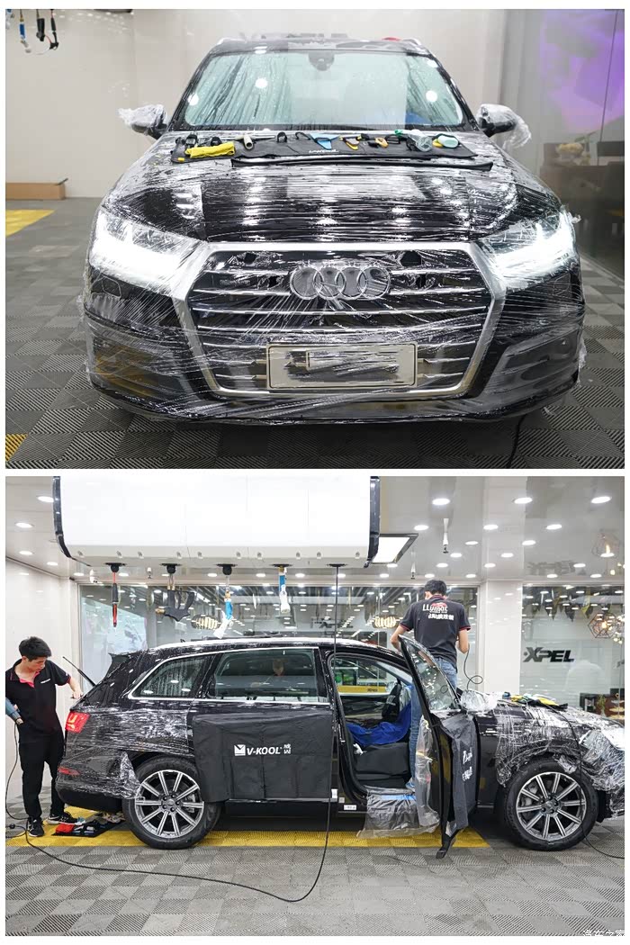 Q7并不是第一台车,所以在膜的选择上就没那么多纠结,由于需要前浅后深的效果,这样即保证主副驾驶位的通透,又保证后排的隐私,所以前档和两个前门选用威固V70s,后门和后挡选用了龙膜的后羿15。