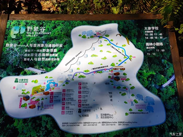 从北门进,走栈道,大概30分钟,就可以到南门,大象表演在那。然后坐索道,从高空俯览整个野象谷,再走一条栈道,回到北门。