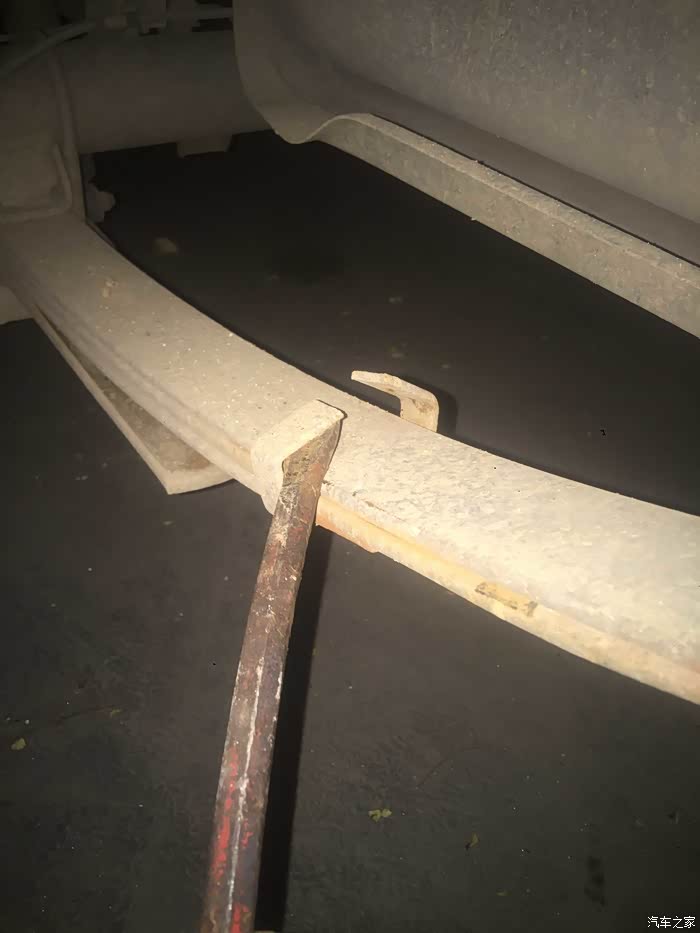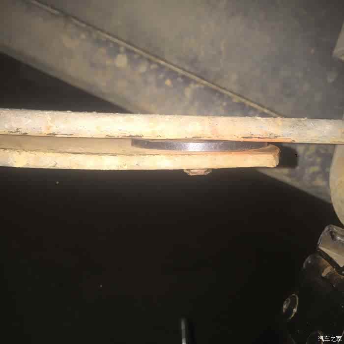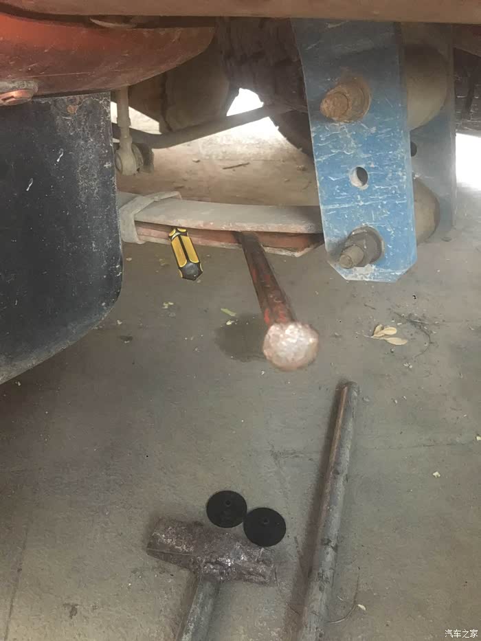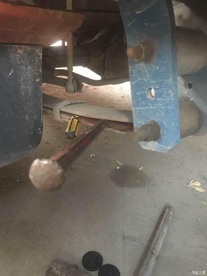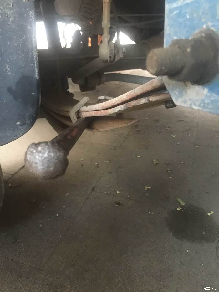 一开始这异响给人一种错觉是来自前轮位置,一个人蹲着观察确实容易判断是失误,再加上之间自己折腾过扭力杆、平衡杆立杆、转向拉杆副帮太、四轮定位的偏心螺丝、前减震器等等,于是把这一大套轮番检查一遍,上路试车问题依旧。最后还是偶然晃动了一下后轮,熟悉的噪音不绝于耳。这才确定了异响发生的位置是后钢板(弓子板)。弓子板相邻之间的间隙时间久了满是锈渣和泥沙,行驶中发生摩擦自然发出异响,用锤子用力敲击震动一下缝隙的泥沙,噪音立马减轻不少。根本解决还是要更换垫片。