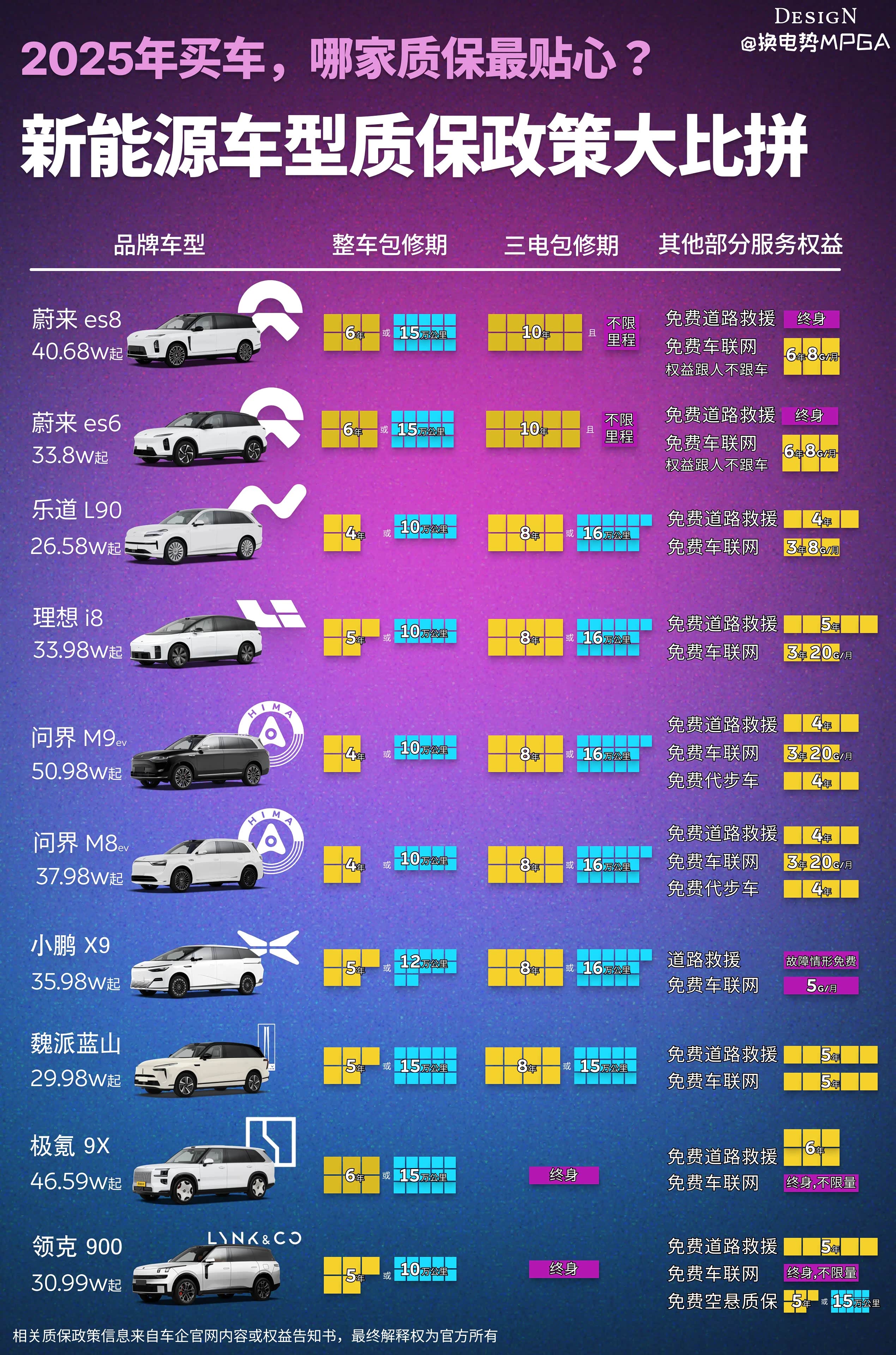 整车质保最强的是蔚来全系和极氪9x:6年或15万公里;