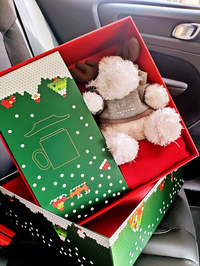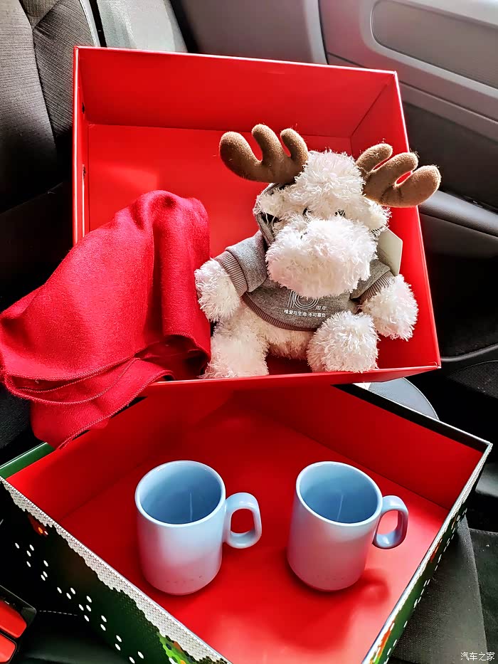 这个圣诞礼包是免税车销售机构中汽总的福利,包含了一个十周年纪念麋鹿公仔,一条围巾和两个杯子。