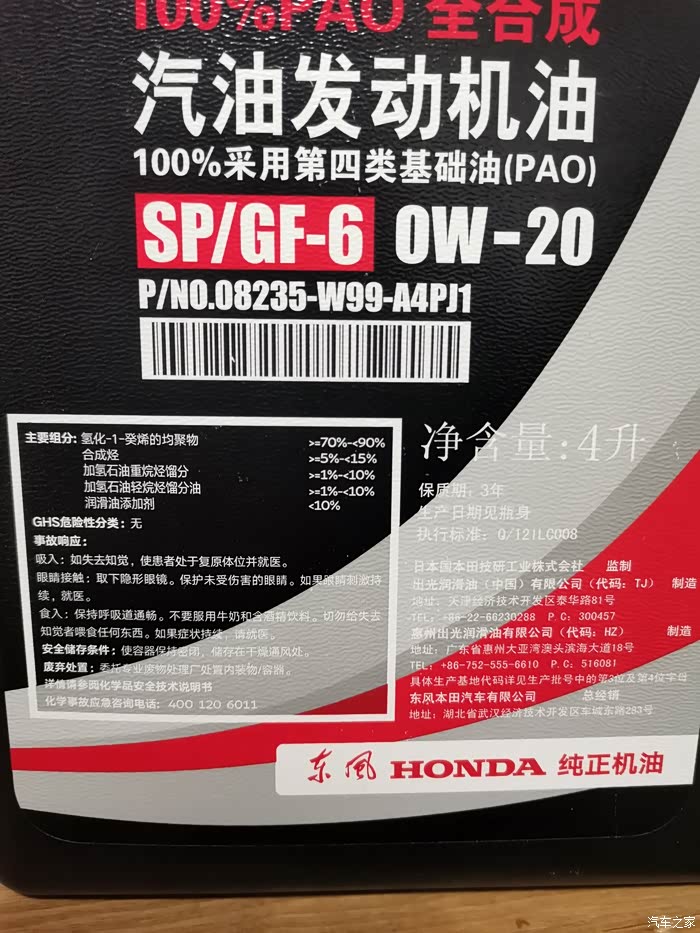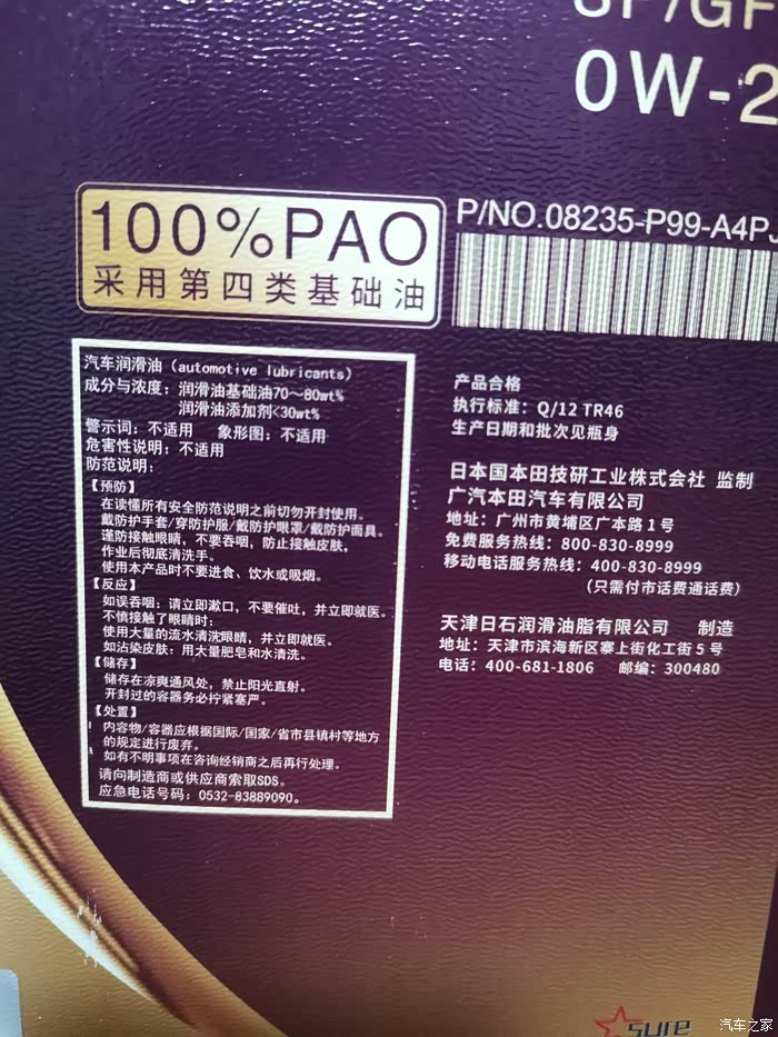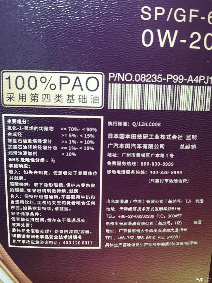 四桶机油对比,分别是广本紫桶出光,东本黑桶出光,广本紫桶日石,东本黑金桶日石。出光的两款机油参数一致,但是区别于日石的。日石的两桶油的基础油含量和添加剂含量均不一样。出光的油添加剂含量均小于10%,比日石的少,日石广本紫桶添加剂小于30%,日石东本黑金桶添加剂小于20%。本田原厂机油虽然是四类基础油,低温流动性好。但是添加剂含量太低,长效性较差,衰减快。