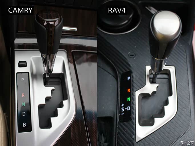 虽然两车的变速箱档把采用相近的蛇形换挡机构,而且排量同为2.5L,但是行驶起来却有很大差别,RAV4采用的是六档手自一体变速箱(带运动模式S),CAMRY配备的是ECVT变速箱,没有运动模式,但是提供了B档可以增强制动效果和能量回收。在低速行车时,两车都非常平顺,即使是RAV4的6AT都难以察觉换挡的动作,但是在80公里时速再向上加速时两车的分野就非常明显了,全力踩下油门的时候,RAV4首先略显迟疑,半秒至一秒后再降2-3个档位,然后伴随着发动机的轰鸣,车速随之跟上;CAMRY则不然,由于有电动机协同发力,呼油的同时候时车速就基本上可以同步跟上,没有半分犹豫,而且来自发动机的噪音也会比RAV4小的多。至于操控方面,由于RAV4车身重心较高,导致紧急变线也没有CAMRY从容,动力及行驶质感方面无疑CAMRY更加优胜。但是需要指出的是RAV4也有他更擅长的地方,173MM的最小离地间隙配合适时四驱系统使得他在乡镇的非铺装路面如鱼得水(这是CAMRY无法触及的痛),当然这里指的不是让RAV4去跑那些真正的越野路面,毕竟他是一台城市SUV。