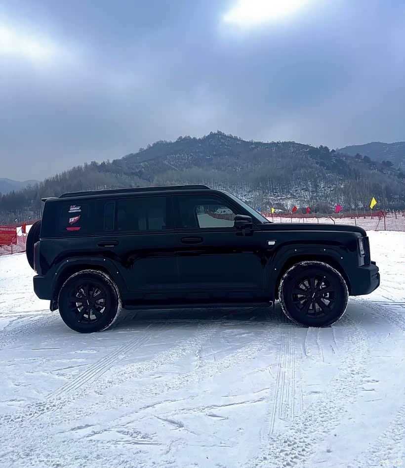 山脚下一片白,我的方盒子车顶也盖了层雪,看着挺敦实。提前拧到雪地模式,感觉第二代Hi4系统立刻就进入了状态,发动机和电机悄无声息地准备好了。