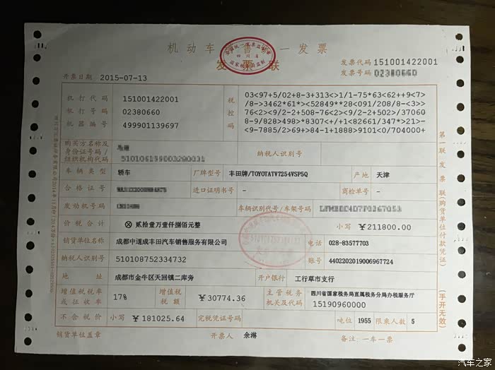 提车篇:7月13日,朋友打电话说,车到了,可以过来刷首付了,我当时非常激动,以为当天就可以提车走,没想到朋友说因为走的是丰田金融,只有今天过来先把首付刷了,保险买了,贷款合同签了,然后4S店把这些凭证上传到丰田北京公司,审核通过无误后丰田公司才会放款给4S店,只有等第二天了。无奈只有13号中午到4S店刷了首付63540,买保险一共8300元(交强险、商业险(包括三者50万、车损、盗抢、不计免赔、玻璃险))。14号中午朋友打电话来说可以过来了,丰田公司已经放款了,可以过来提车了,二话不说马上一个滴滴打车就到了4S店。到了4S店车子已经停在门口的停车位上,马上就去打临牌,刷自动落锁、遥控升关窗,完工,提车出门加油,第一箱油足足加了435元,跑了480公里。因为还在磨合期,所以还是挺满足的。说了那么多,开始上图吧!都是水果机拍的,各位大神勿怪!(牌照就不P了,在成都的车友看见了鸣两声喇叭吧!)