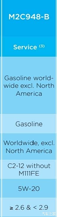 4.还有一款常见就是M2C948-B(5W-20)机油标准,这个标准估计很多福特车主都很头疼,例如蒙迪欧1.5T用的就是这个标准。这个机油标准是基于ACEA C2-12的超准开发的5W-20机油(要求HTHS在2.6~2.9之间)。那看到这里了,是不是这个标准有点熟悉,对就是C5的标准。但是12年没有C5标准,C5是16年出来的标准。