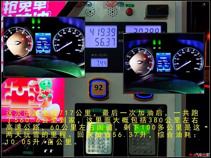 这次行程全程717公里,从大滩到家560公里,其中有高速,国道,还有两天玩雪的100公里,综合油耗10.05升/百公里,感觉硬派越野车有这样的油耗,很不错!