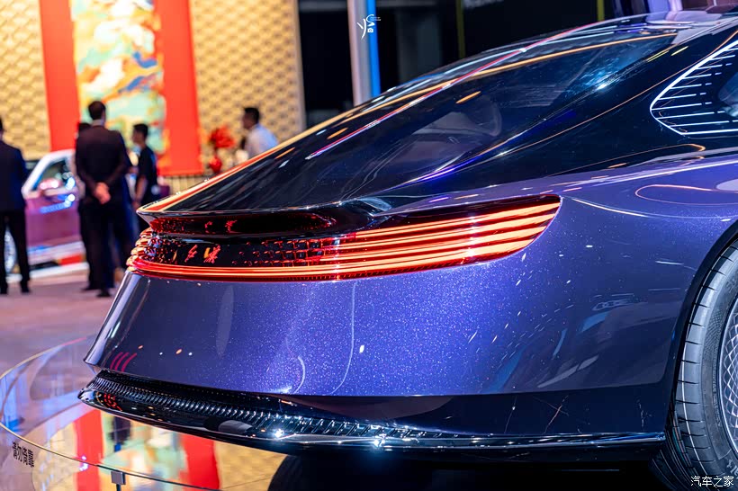 来到车尾,溜背的线条造型,让我联想到了海豚,弧形的溜背设计是一整块玻璃浇筑而成,并且中间还有红旗车辆特有的红色镀铬装饰条点缀