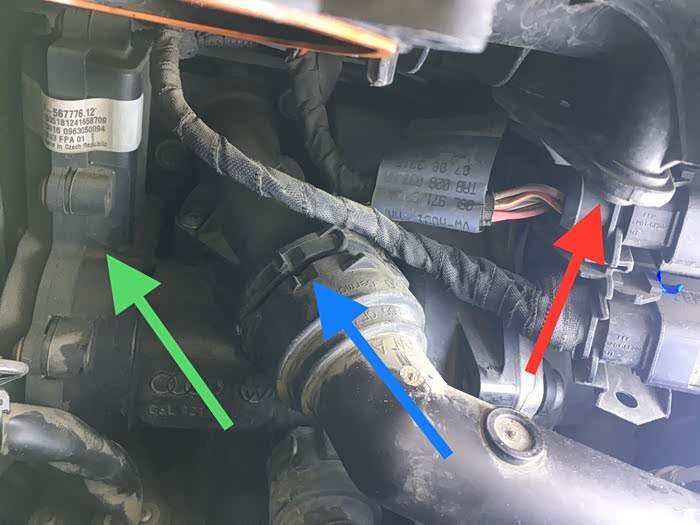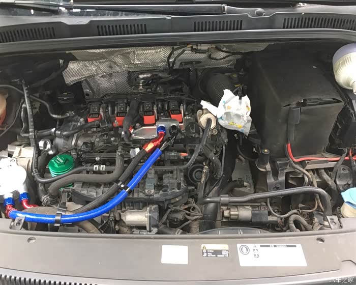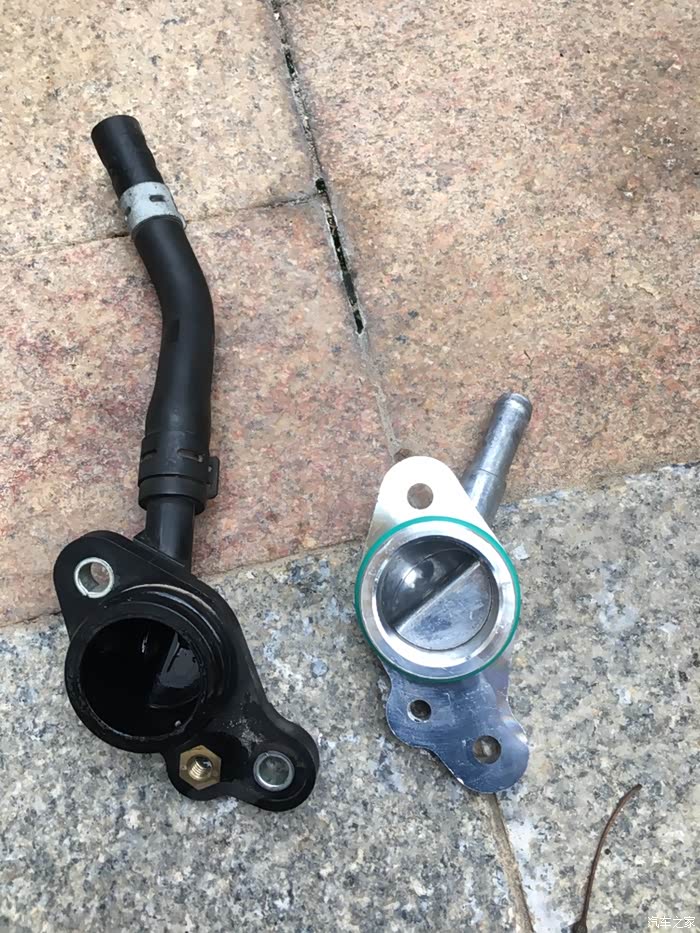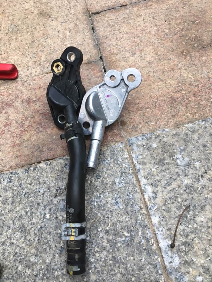 冷车启动报下图故障灯亮起,热车一会后重启故障消失,用5053检测及咨询坛内进口大众维修大师判断为电子节温器故障,检查冷却液没发现渗漏,估计是冷却液渗进执行元件N49315造成的,就这样用了两个月,准备好配件、材料,周末终于自己动手更换电子水泵,换机油周期也差不多到一起干了。