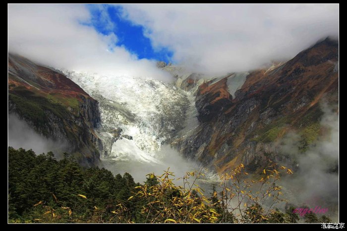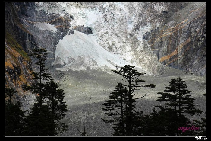 远处冰川顺山体二下,因为天气还不是很冷,并没有呈现出壮观的冰白颜色