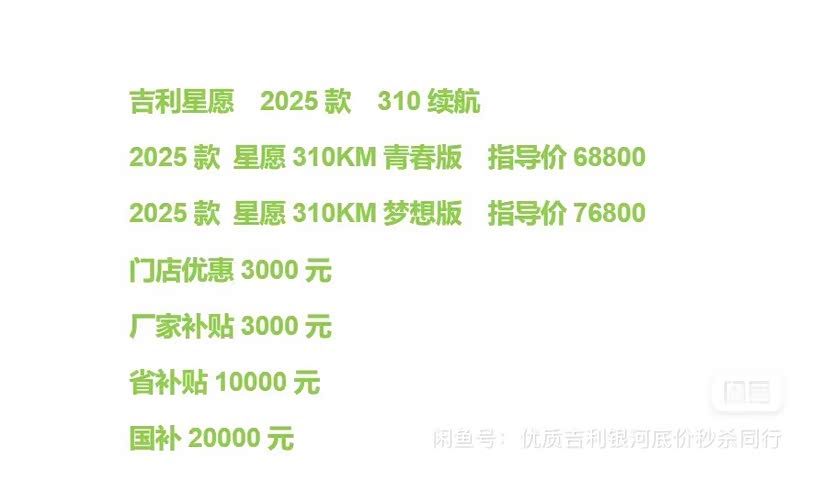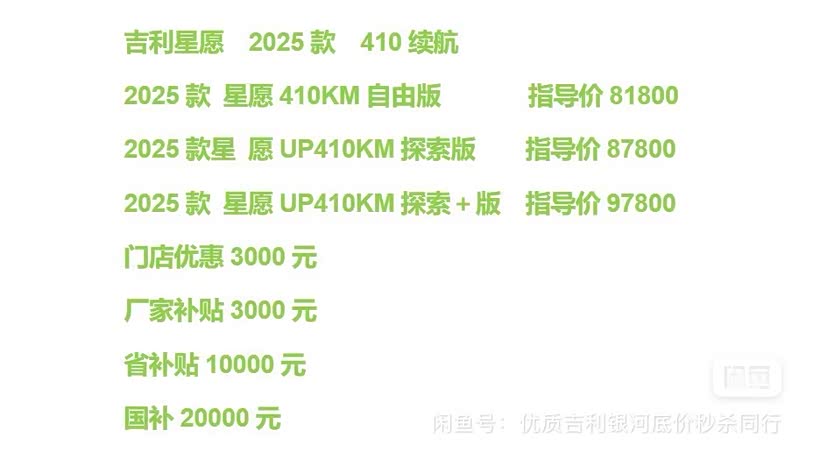 吉利星愿,4S店全新车到店,310KM续航,410KM续航,清仓清库存,扣1再优惠,限时、限量、现价。
