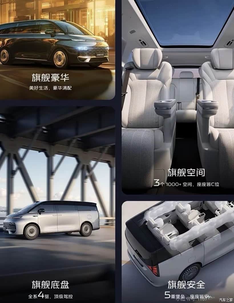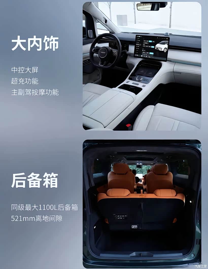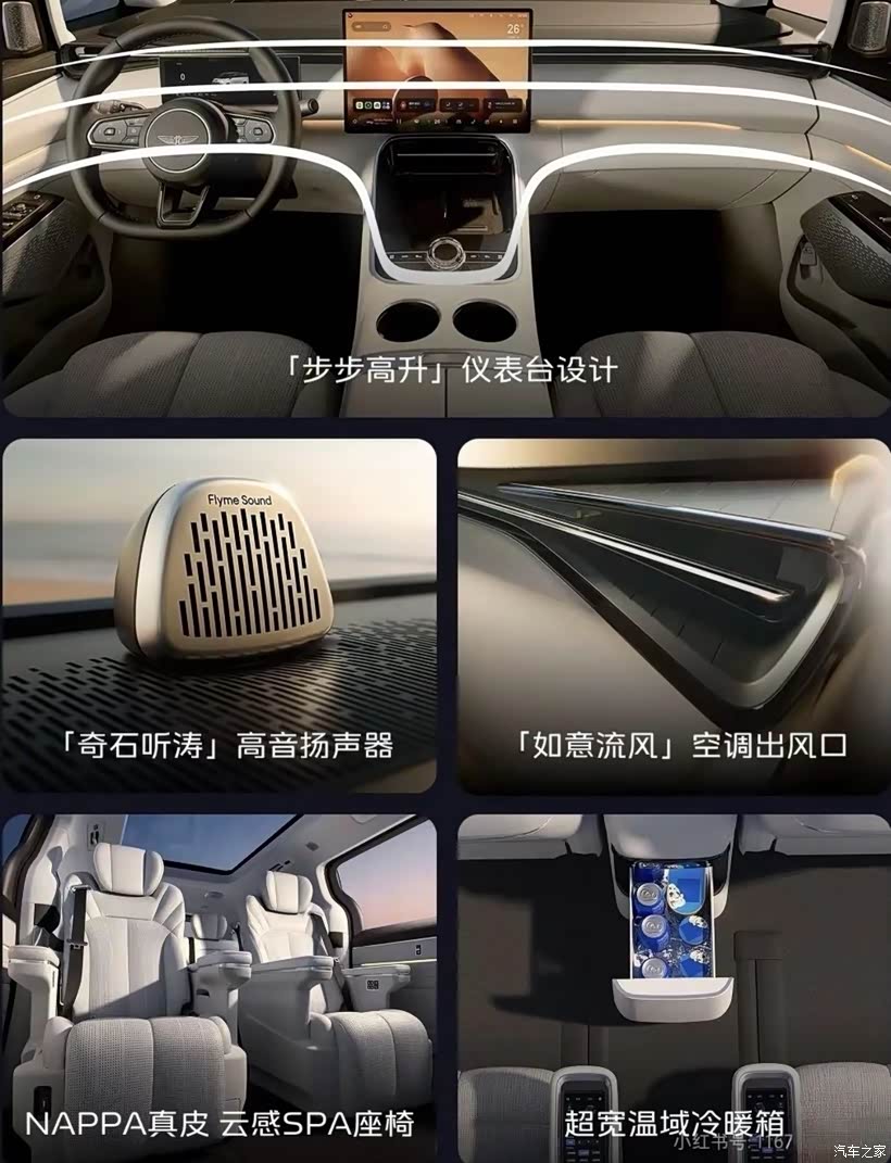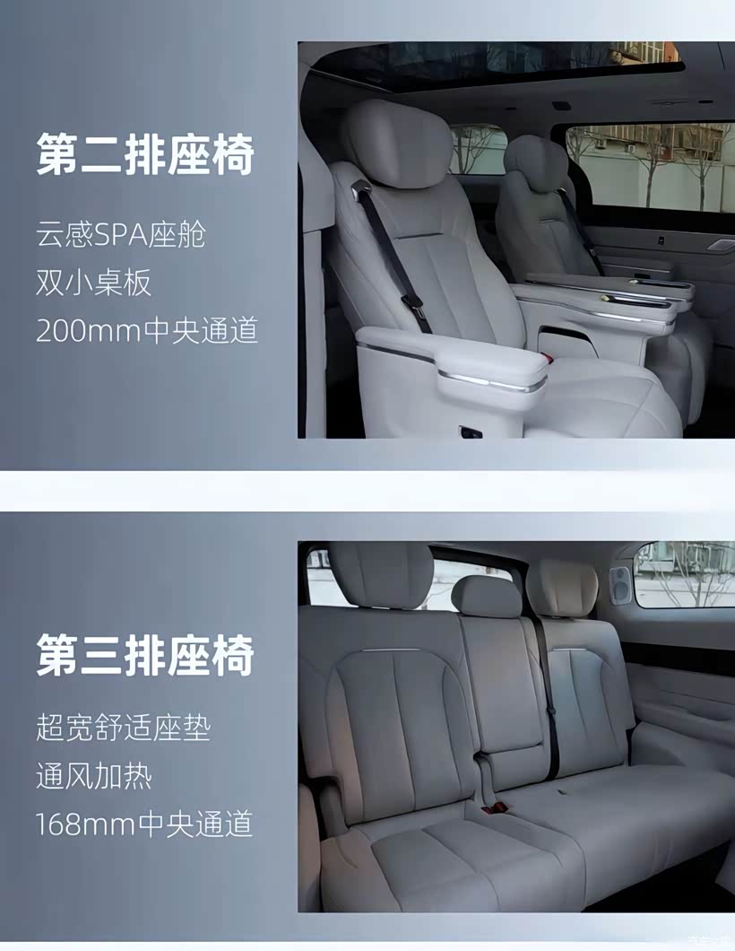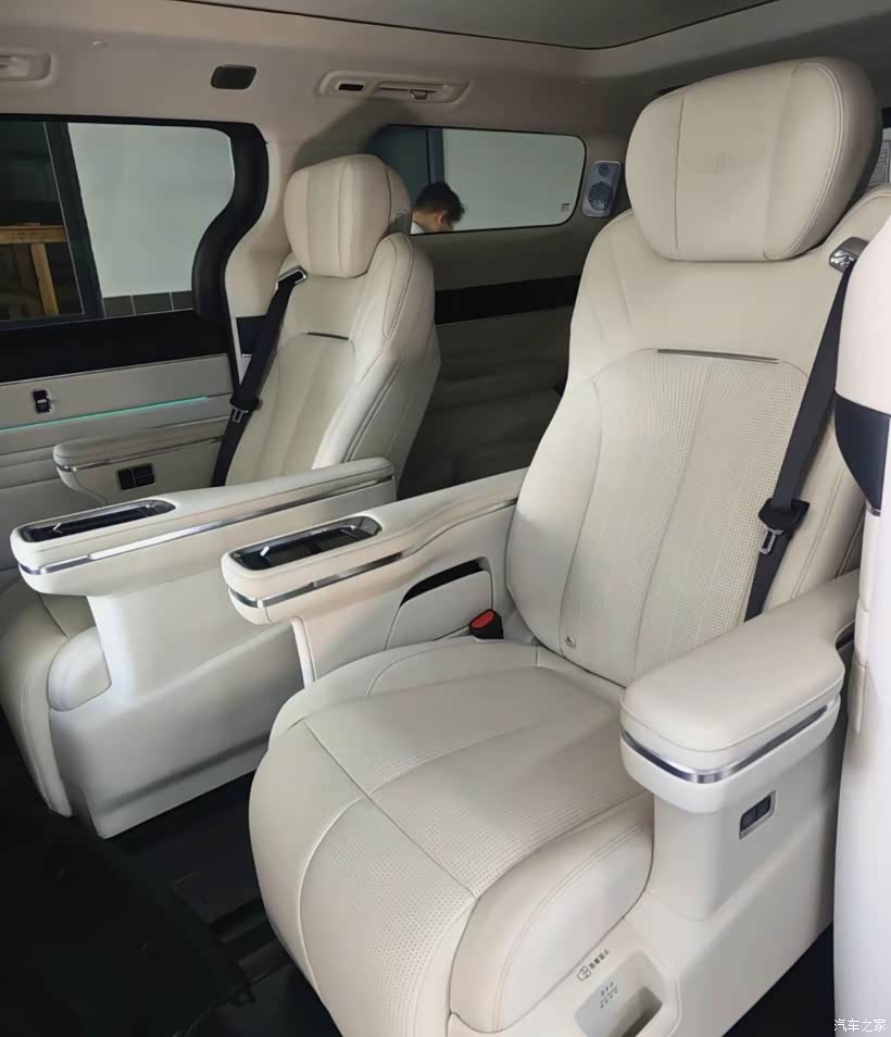 吉利银河V900,5360mm车长、3.2米整的轴距带来强大气场,尤其是车高全系超过1.9米,颇有自带"小高顶"的效果。吉利银河V900提供了云感SPA座椅,实拍展车提供了加热、通风、记忆、按摩功能,且二三排可以躺倒,并提供了二排双小桌板。音响采用了Flyme Sound无界之声27扬声器系统,后排提供大尺寸娱乐屏幕。冷暖箱温度设定支持﹣6℃至50℃之间。安全配置方面,最高搭载11处环抱式气囊,配备224L侧气帘,贯穿三排。且三连座座椅采用全金属背板,以对抗追尾穿刺风险。