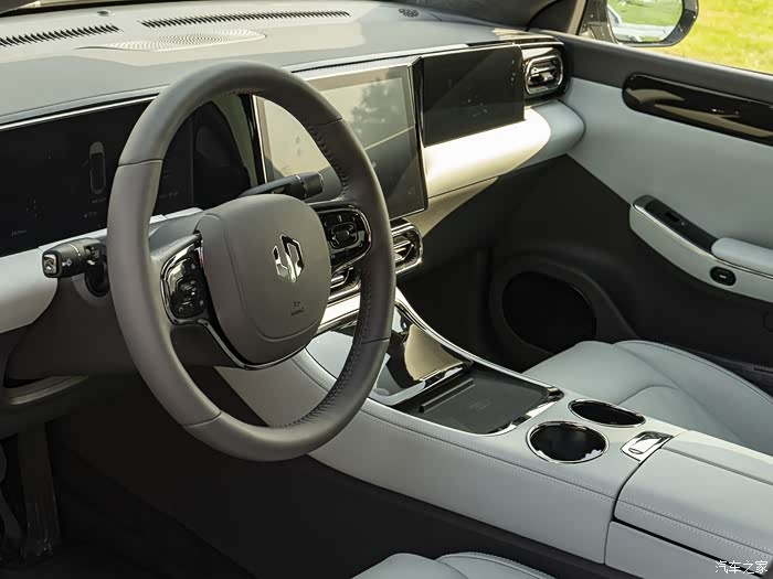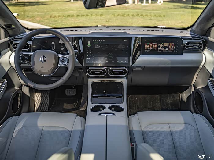 对于一款中型轿车来说,宽敞舒适是主旋律。坐进零跑C01的车内,扑面而来的就是一股浓厚的“新势力”气息,三联屏内饰占据了绝大部分视线。不过相比那些简单粗暴的三块大屏,零跑C01的三块屏就显得更具质感了,中间的12.8英寸中控屏向外凸起,两侧的10.25英寸液晶仪表以及10.25英寸副驾驶娱乐屏则放置在了更靠远端的位置,这种T台型三联屏设计,连贯统一,三屏联动也让视觉感官向两侧自然延伸。时空胶囊的设计元素广泛应用于空调出风口、三联屏边角、杯架等处,营造科技静谧氛围感,减少视觉负荷。这种全对称式设计,对于“强迫症”朋友来说简直不要太爽!