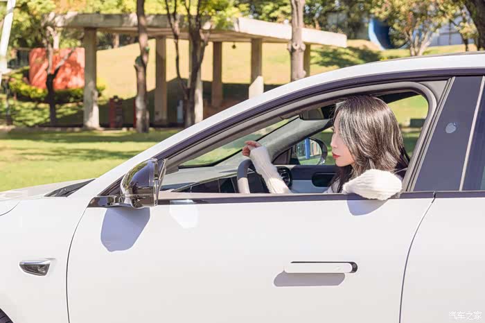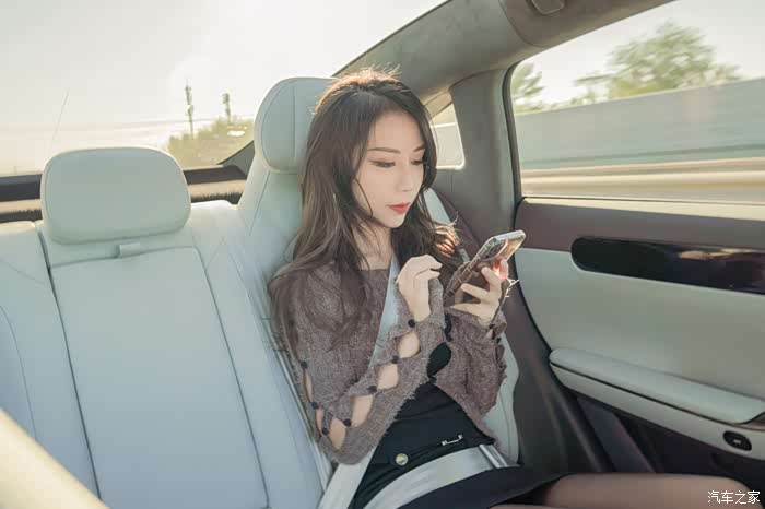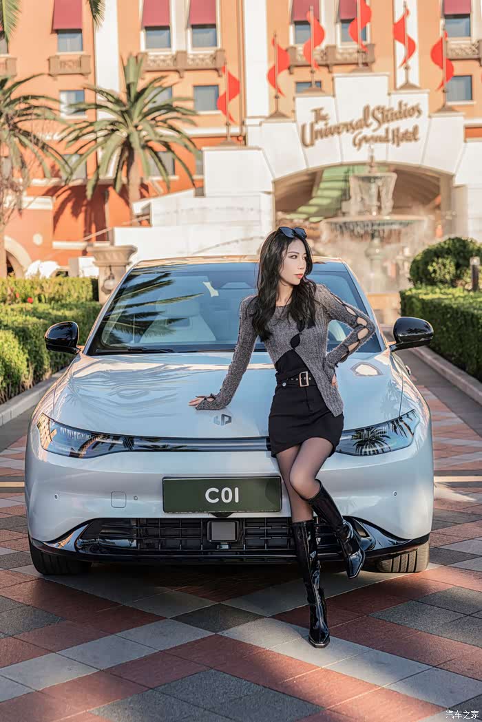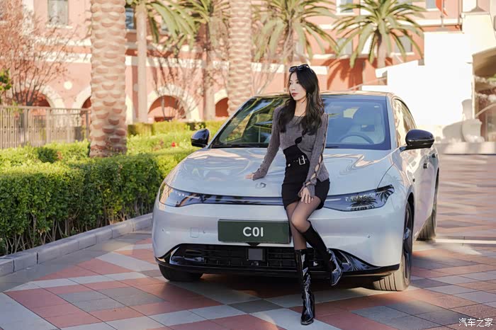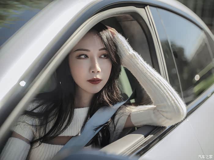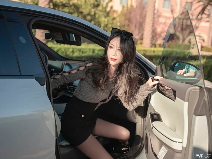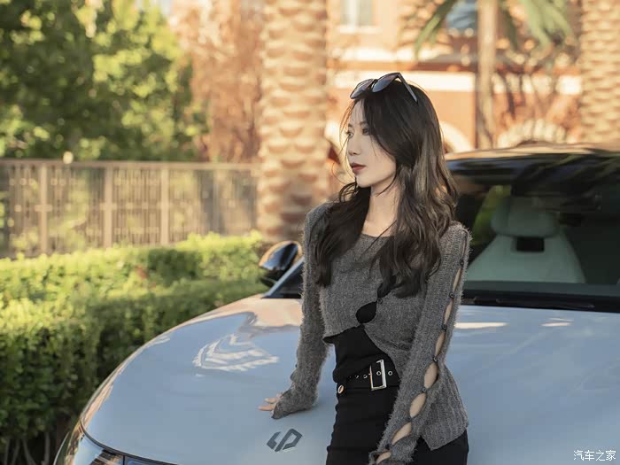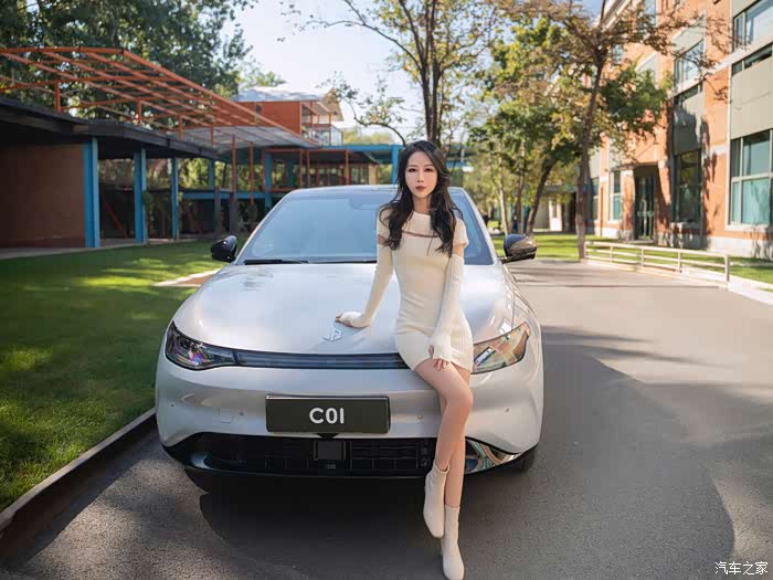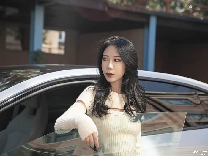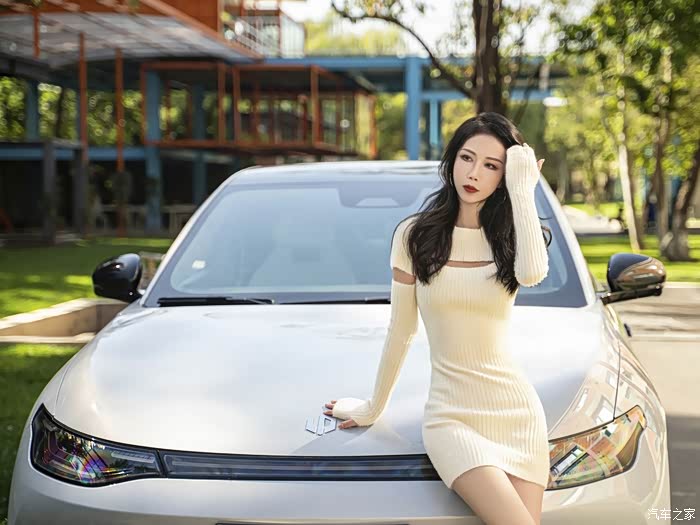 琳琳穿着白色毛衣坐在车头和零跑C01合影 ,人车搭配相得益彰。这里给大家普及几个宝爷的常用拍摄机位,美女坐在车头车灯和标之间的位置,构图拍半身大腿处即可。这样子既能比较完整的看到车辆前脸,同时还能欣赏到美女优雅的姿态。