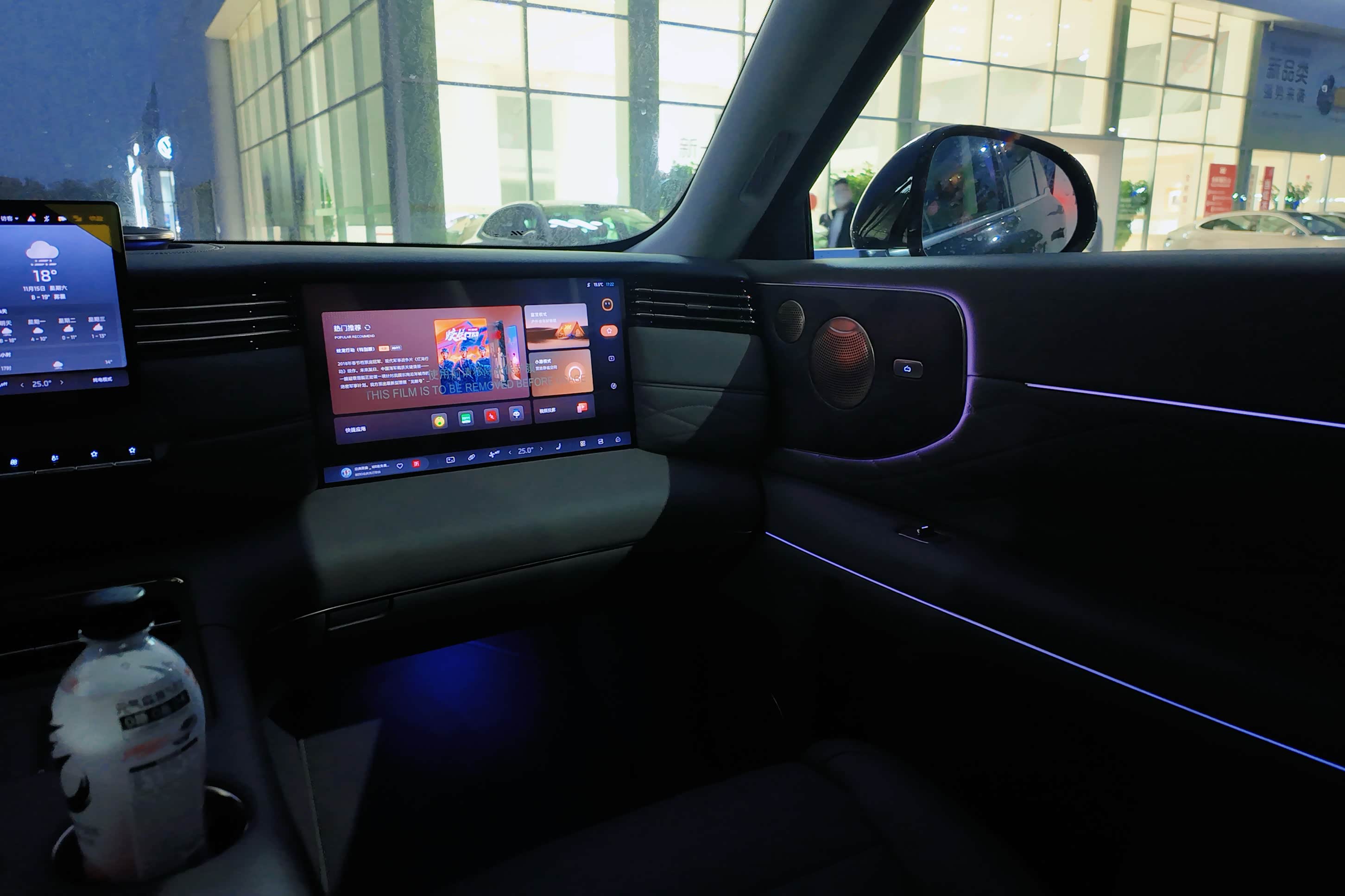 途中试了一下雨夜模式,雨夜模式下,副驾屏幕是自动关闭的,然后整个前方的大连屏的界面风格会改为暗色模式,同时左右两个电子后视镜会显示在屏幕的两边。当然,很多人会说中间上面这个中央后视镜有点小,但其实智己全系的车都是这样,这个后视镜甚至可以折叠收起来,需要看后面情况的话,可以通过方向盘右侧滚轮向上滚动,就可以在屏幕上看到后车顶摄像头的实时画面,很清楚,视线也比物理后视镜好多了,下雨天也是一样的清晰。这一块在下雨天,雨夜模式真的会很安全很多,也会让驾驶人安心很多。