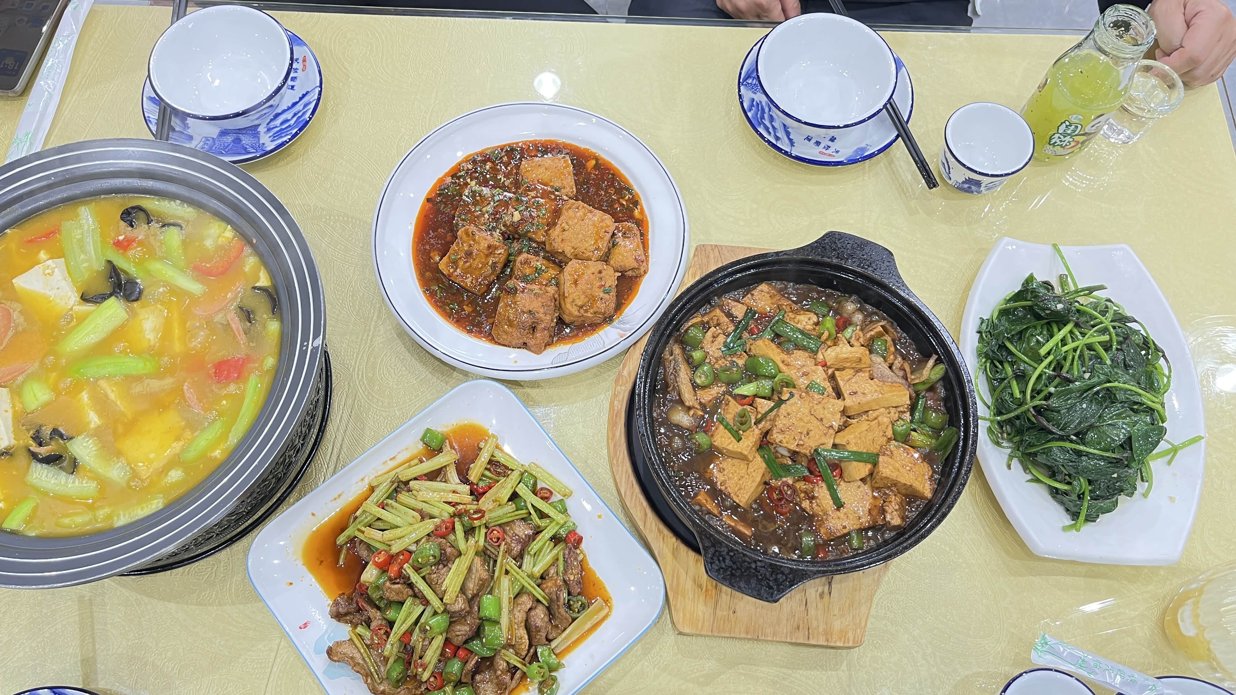陪堂妹夫妇游剑门关,行至剑阁天赐美食城,自然要品味一场心心念念的“邓胖子豆腐宴”。四人围坐木桌,点了五道荤素搭配的菜,刚下单便闻见后厨飘来的豆香,我们品着茶水,忍不住频频抬眼张望。