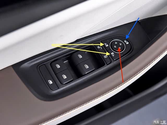 黄色标识为外后视镜选择按键, 左侧外后视镜按键,右侧外后视镜按键 。