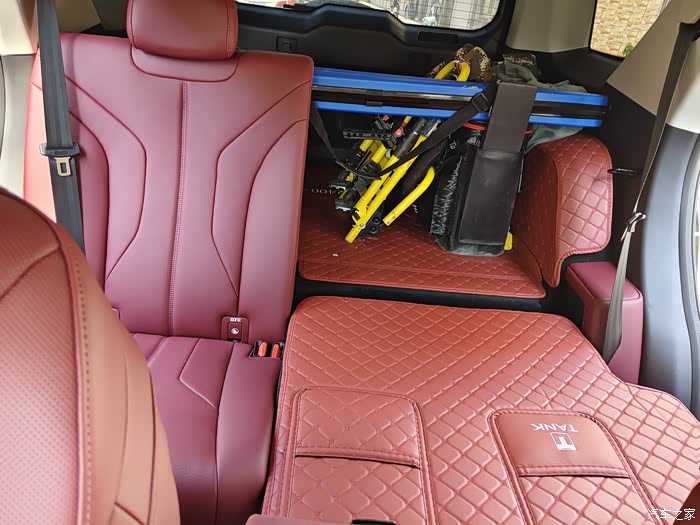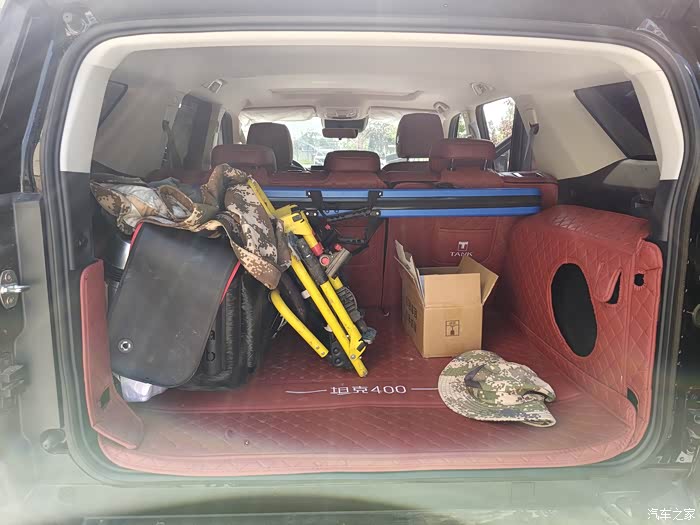 虽然不是上山露营但各种装备也得准备齐全。凳子,水壶,登山包等等装了半个后备厢。虽说装备有些多,但对于坦克400的后备厢来说不算多。平时它的后备厢感觉内部空间比较深,宽度也够用属于长方形的储物空间,对于日常家用来说问题不大。当然在日常生活中像帮别人搬家,一家人出去旅游度假自然会出现后备厢不够装的情况,而关于这一点不用慌,坦克400的后排座椅可以放平这样就会空出一些空间,想要当货拉拉不太可能,但满足日常家用没问题。