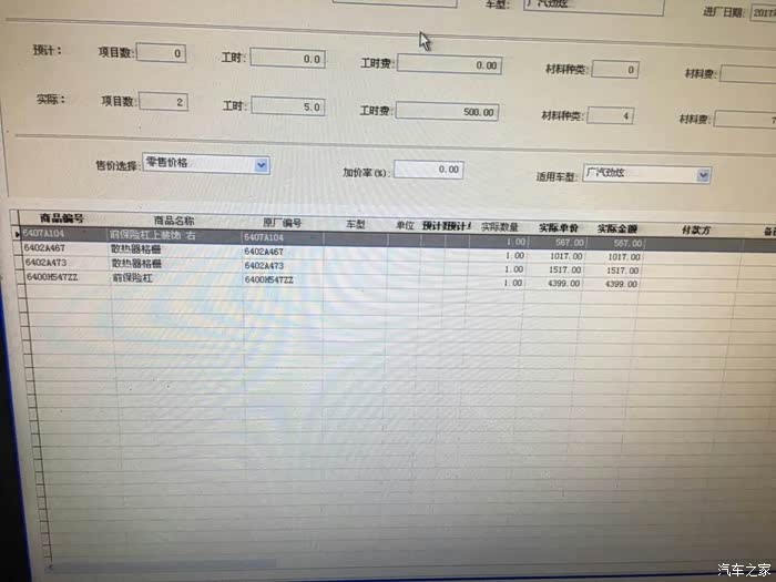 就在前天,车给我修完了才联系我然后还把钱给我垫付上了,然后给我打电话说 今天能不能来刷卡,没空的话 我这不给你把车送过去 拿着POSS机, 我都不知道车修了什么 修的怎么样就要让我交钱,我当时也是服了, 我说把维修单给我发一下,然后就收到了这一个图片,上中下网+前保险杠 8000块钱! 单一前保险杠 4399!!!