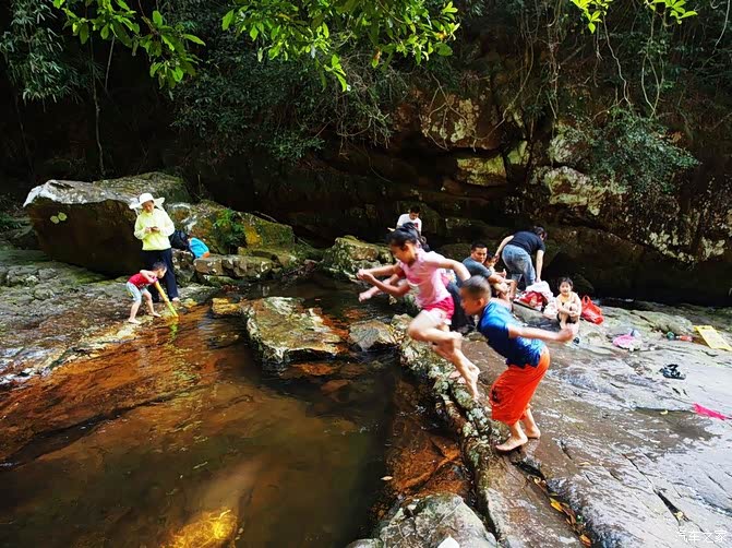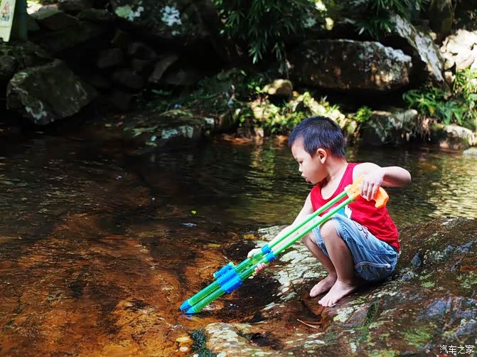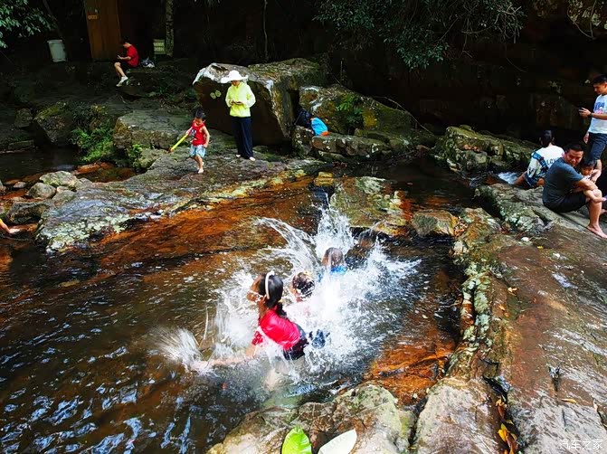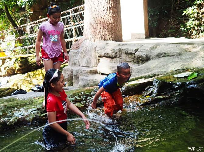 看,大场景就是这样的,溪水从上面流淌下来,先是浅水,再汇成稍微深点的潭,大概半人深,孩子们在里面玩,也毫无危险,非常安全,家长们只需要站在旁边叉腰看着,偶尔呼喝几句,就行了。