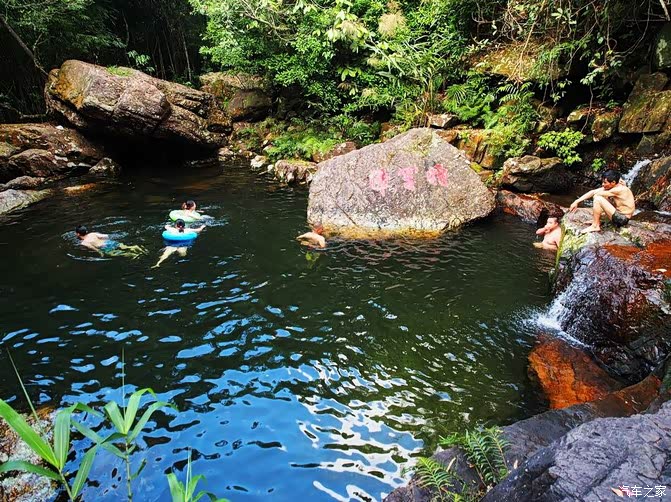 旁边有山岩平台,可体验跳水活动,上方有山泉飞瀑飞流直下,游人可以站者或者躺着冲山泉。