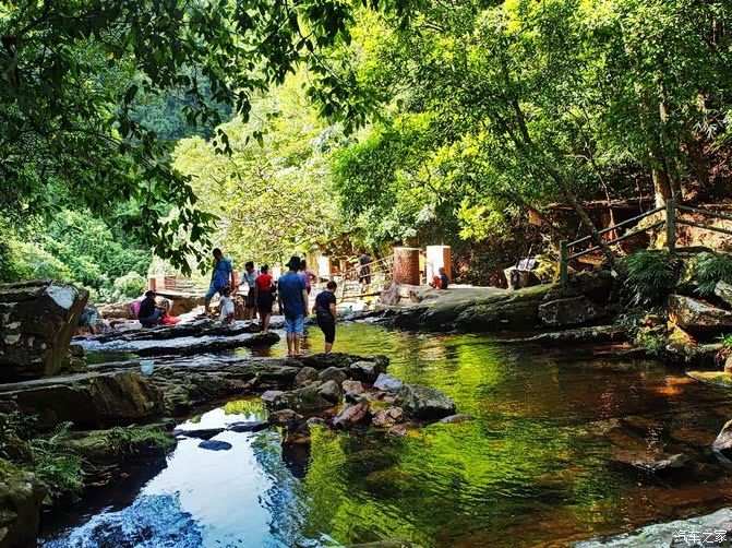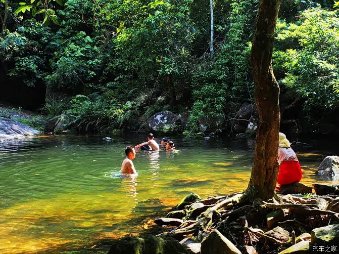 溪中的石头上,有人坐着在泡脚。五月的广西,已经很热了,大概类似于江南的大伏天的温度,只要在外面,就是一身汗,这样清凉的溪水带来的吸引力有多大,也就不用多说了。