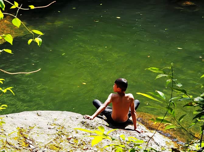 桥那边是个小水潭,几个孩子正在跳水,大人们乐呵呵地坐在潭边,看着他们玩闹。