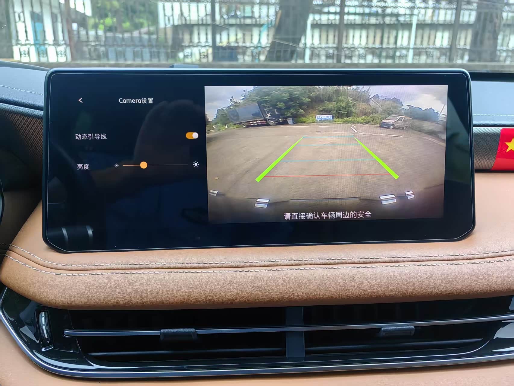 言归正传握着它的电子档把挂入倒档以后几乎零等待它的大屏幕上会立即显示出后方影像,虽说屏幕不大但清晰度比较高不夸张的说都可以清晰的看到后方面包车的车牌号,画质蛮高的。除此之外还有倒车辅助线只要打方向辅助线就会随之变动,对于倒车的路线有个提前预判,这样倒车再也不用看它的左右后视镜就可以轻松搞定。