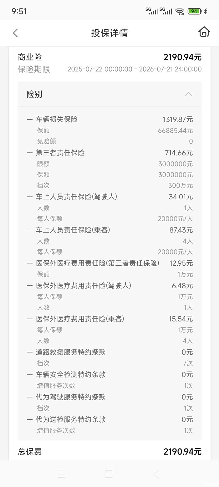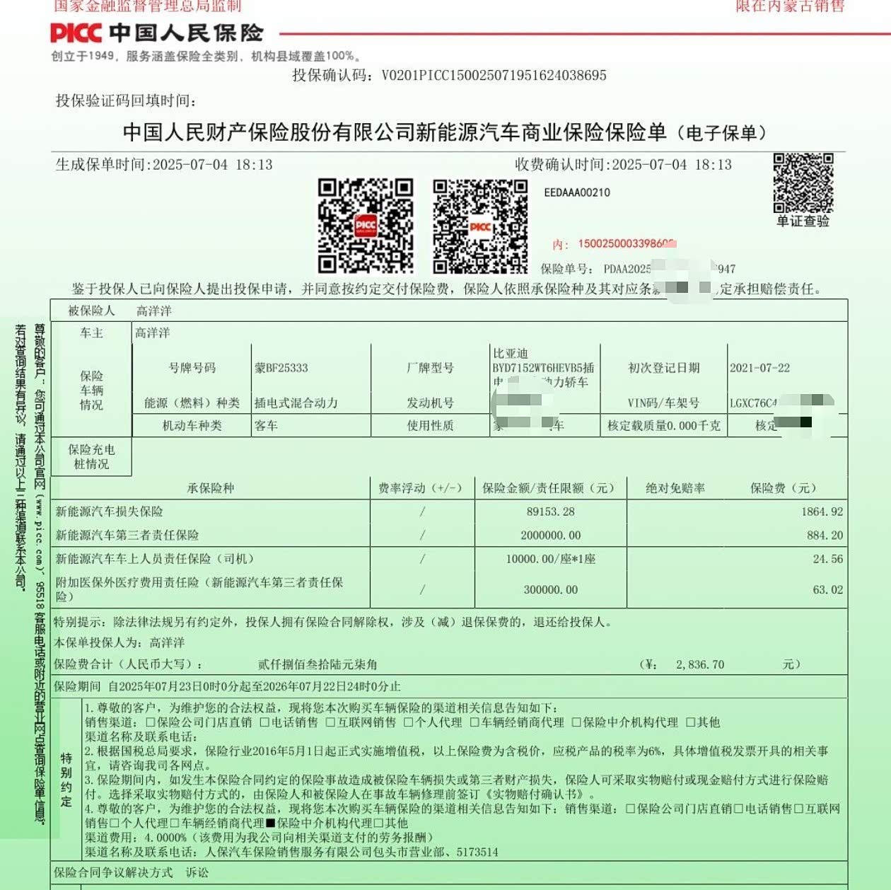 接下来说说保险这一块,交强险665元,没啥好说的,只要不出险就可以每年降低。商业险建议还是买上,车损险,三者200万,座位险和医保外用药,总共是2836.7元。