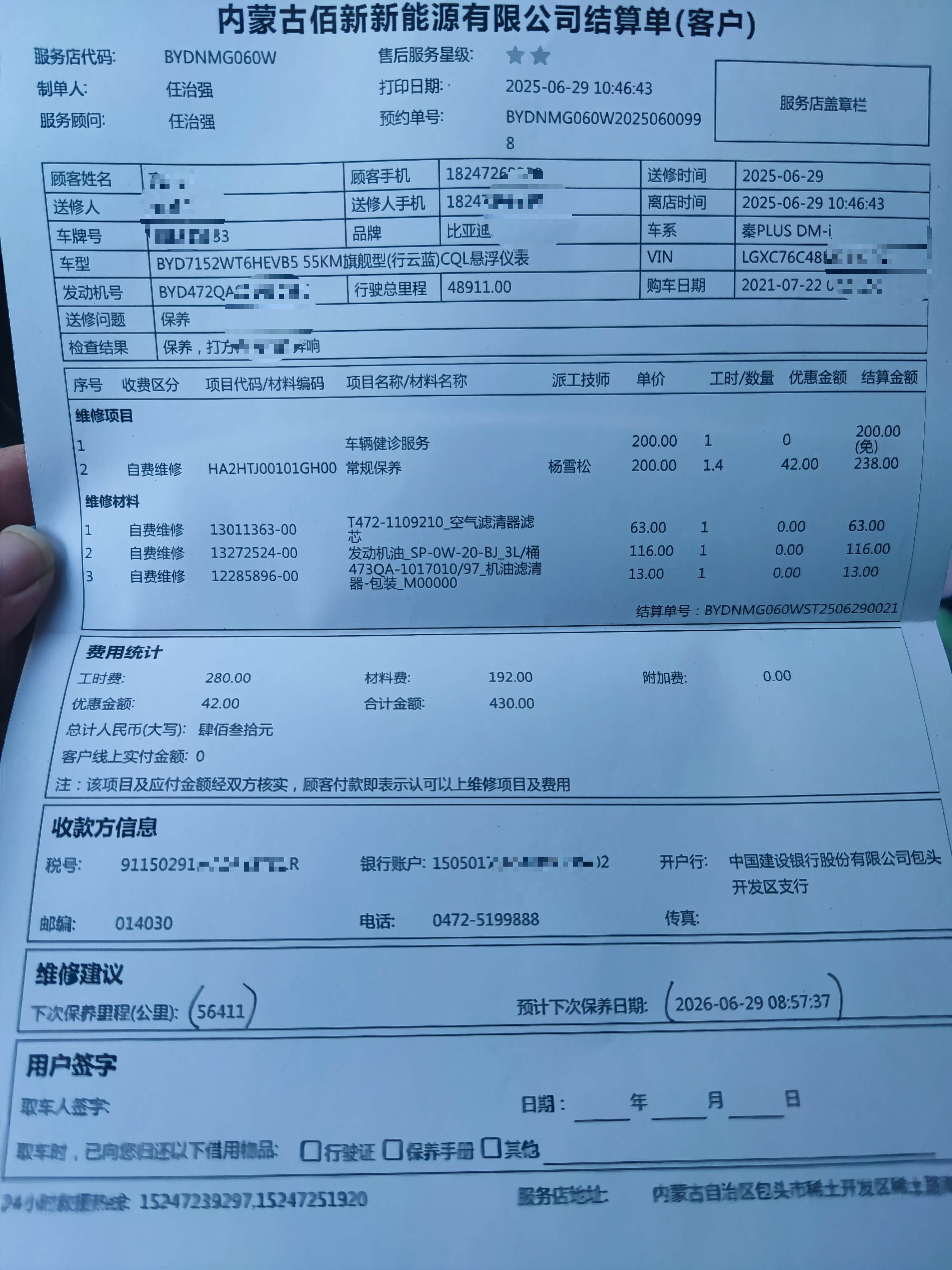 【保养费】430元(常规基础保养,无额外项目),这里比较有意思的是材料费192元,工时费280元,优惠42元,优惠完工时费仍然有238元,可谓工时费比材料费都赚,也是无语了。