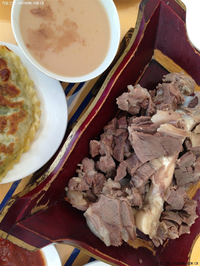 早上吃了手抓肉和奶茶。当地人是早上才吃这个,晚上没有新煮的肉。
