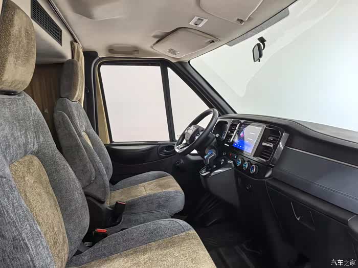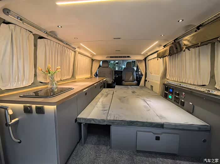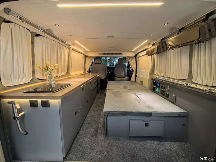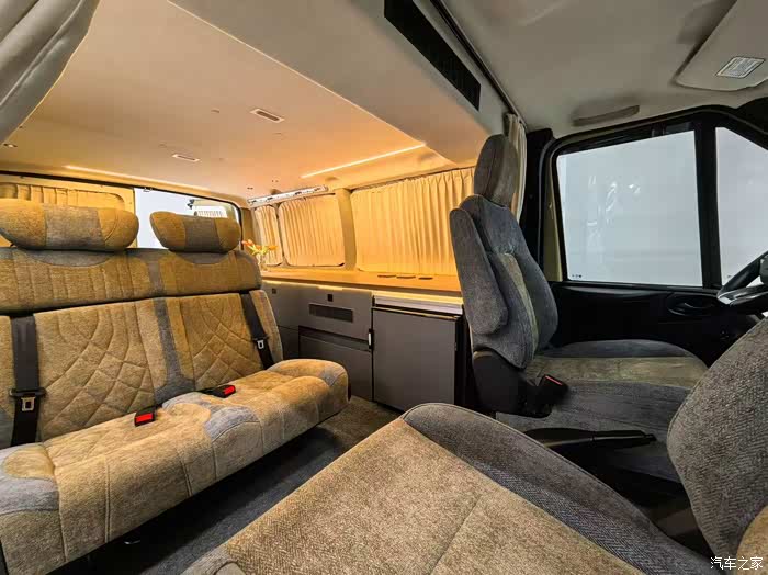 车内座椅采用黑灰色霍尼尔绒与翻毛皮材质,触感柔软舒适,且具备良好透气性和耐磨性。搭配隐私玻璃、整车高级地毯及绒布遮光窗帘,以及超静音空气循环机,打造私密又安静的休息环境。