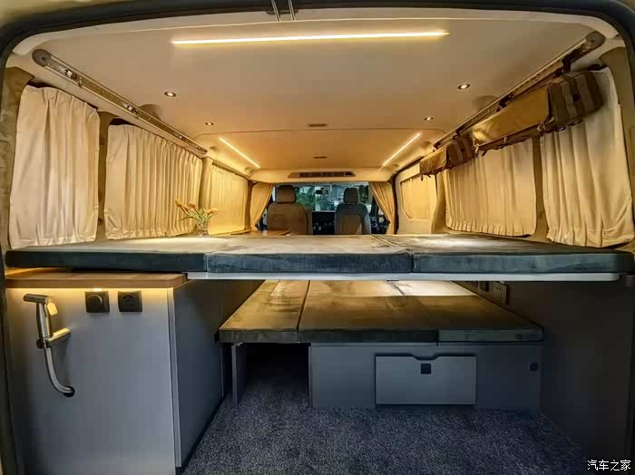 边柜是该车型一大亮点。边柜沿车厢一侧延伸,看似低调,实则蕴含巨大实用价值。多个分层抽屉可有序存放地图、证件、零食、小型工具等杂物;开放式搁板区域适合放置书籍、平板电脑、旅行纪念品等常用物品,方便随手取用。部分边柜还巧妙预留杯槽与充电接口,可放置保温杯,为电子设备随时充电续航 。此外,车内侧边设置多条战术快挂系统结构,用于悬挂衣物及户外装备,充分利用每一寸空间。