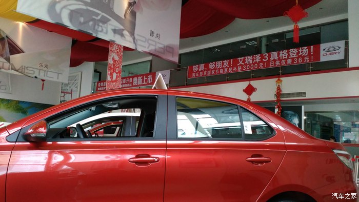 4:艾瑞泽3,车型漂亮(个人看法)车体宽度有一定优势,配置一般,价格还能接受,所以一直是我的关注对象 ,纠结于后鼓刹 ,但中控布局,车身造型以及颜色 都是我的菜所以一直左右徘徊。 还是实车体验才具有说服力! 探明价格前往4S。一进门, 一辆热赞红艾瑞泽3立马给我一种强烈的视觉冲击,中控 虽然也是塑料材质 但感觉很有质感,没有硬邦邦和廉价的感觉。内饰做工不错,座椅包裹性很好 软硬适中,中控按钮布局合理。前脸和尾灯个性十足,奇瑞新标志设计的不错。空间挺大的,后排座椅中间几近全平这一点很满意。
