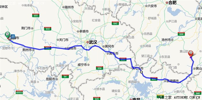 第一天,6:10起床,6:45出发,6:55上高速,沿着导航推荐的路线(宜昌-武汉-黄石-黄梅-太湖县-安庆市-铜陵市-汤口,881kM)向黄山前进。可能由于赶早的缘故,直到8点以前,高速上车很少。9:45,到达湖北江夏服务区与妹妹一家人汇合。江夏服务区车很少。