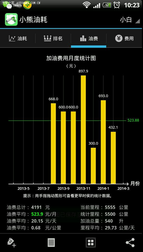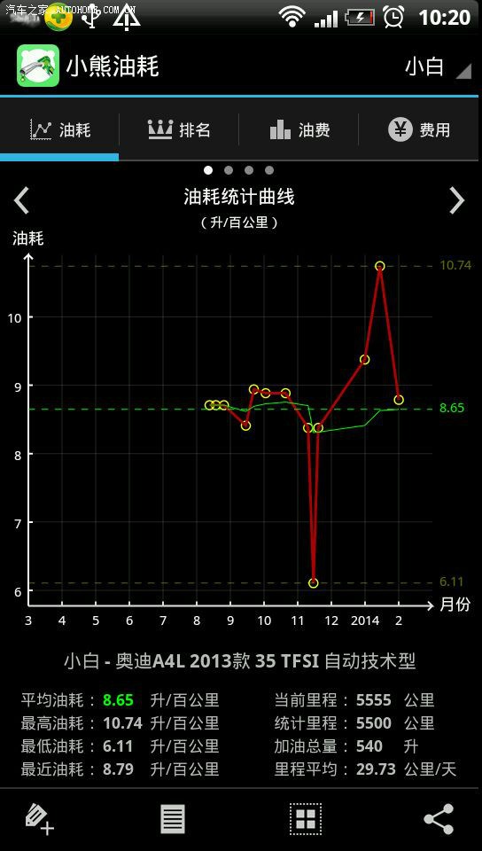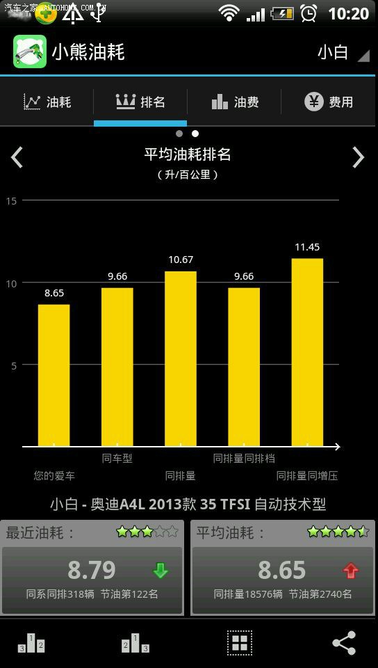 平均油耗8.65升/百公里。油费平均:0.68元/公里。上图为证: