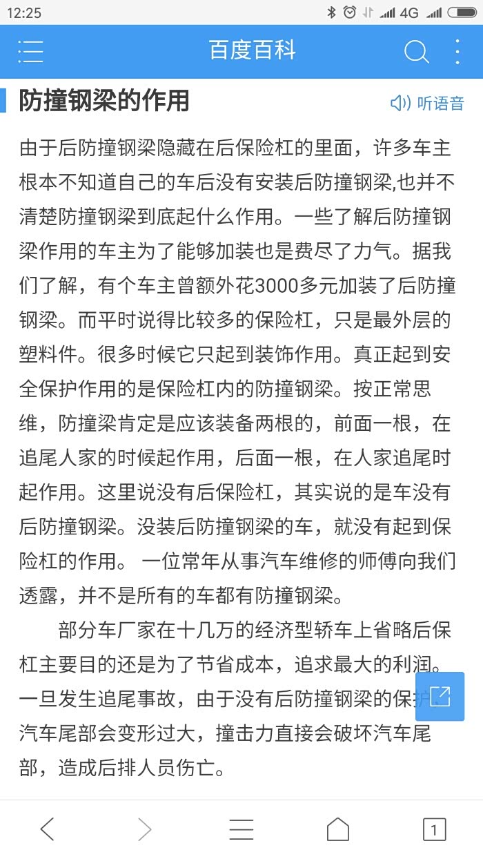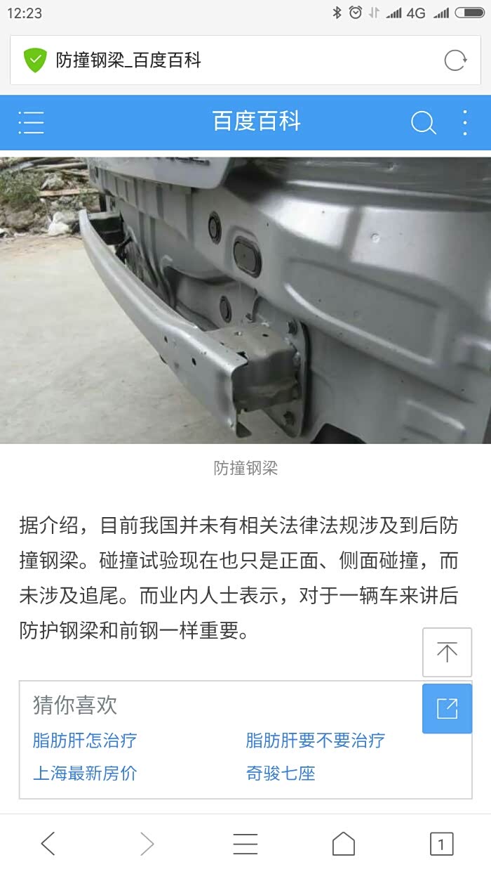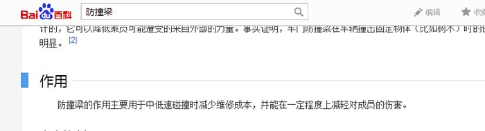 叫百度看看,你就百度百科啊。。。 防撞梁在美国叫bumper,下面原文见NHTSA美国国家公路交通安全管理局网页(http://www.nhtsa.gov/cars/problems/studies/Bumper/Index.html): 不是专门设计为车辆碰撞或成员保护的。防撞梁不是一个旨在预防或减轻乘员伤害程度的安全特征。防撞梁是设计用于在低速碰撞时保护发动机罩、行李箱、油箱、排气管和水箱,还有前后灯等。 3 美国防撞梁防护法规 What are the Federal regulations for bumpers? 车辆以2.5英里/小时(4公里/小时)撞击障碍物。 9 美国加拿大欧洲防撞梁评判标准对比 How does the U.S. the bumper standard compare to the Canadian and European standards? 加拿大标准,车辆以8公里/小时向前撞向固定碰撞障碍物,车辆以8公里/小时向后撞向固定障碍物; 欧洲标准,车辆以4公里/小时碰撞障碍物;