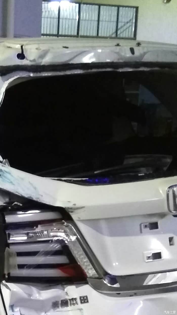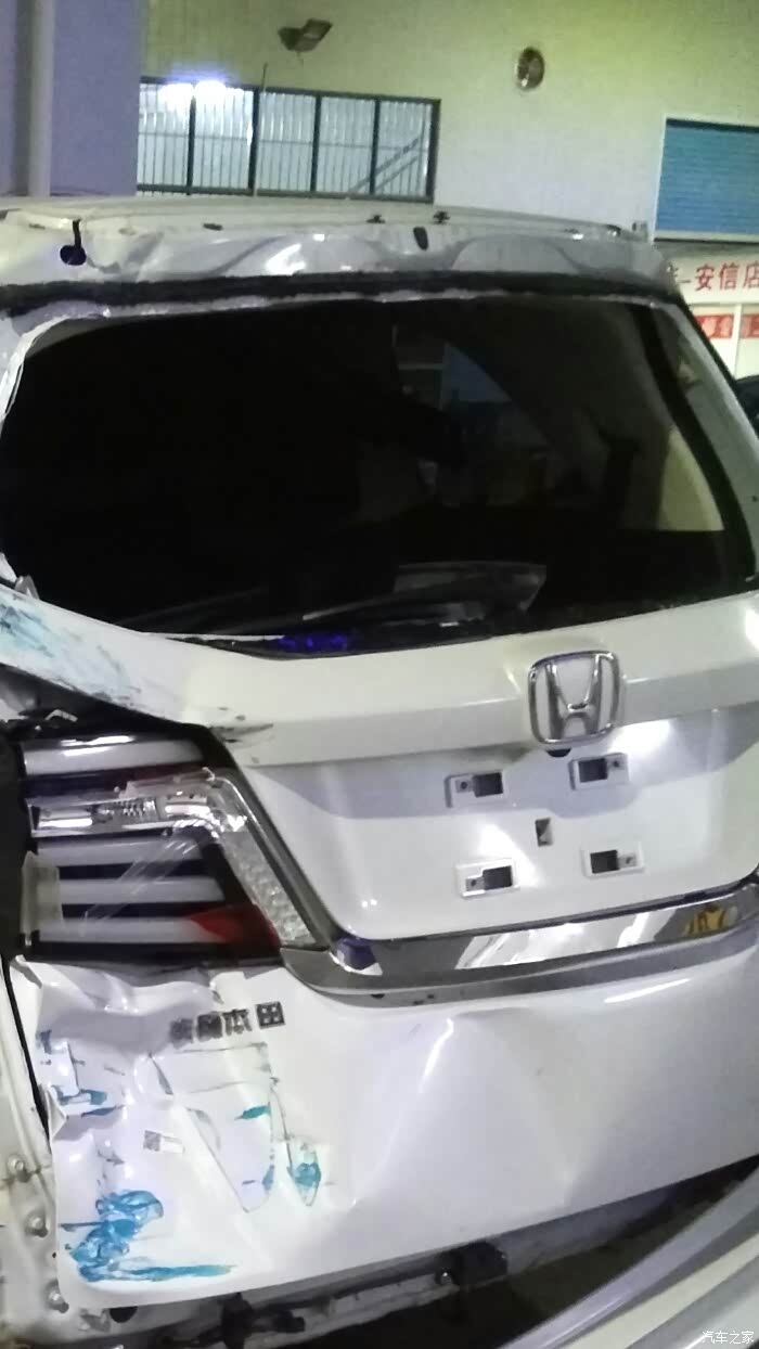 偶遇本田艾力绅被追尾事故车,实拍尾部损毁情况,尾部未加装防撞钢梁,第三排座椅被直接撞断,若第三排坐人后果不堪设想。还是SUV的厚厚防撞钢梁好。放大图片给大家看被撞得向前位移的第三排座椅(黑色真皮),第三排右侧座椅(被扔在车厢内)已被撞得和第三排左侧、中间座椅分裂开来,车身左后侧白色保险杠被扔在图中第二排右侧座椅后面。