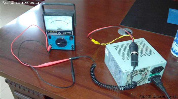 下面量一下输出电压对不对,就是说,是不是12V。把万用表调到直流50V,正极接黄线,负极接黑线——