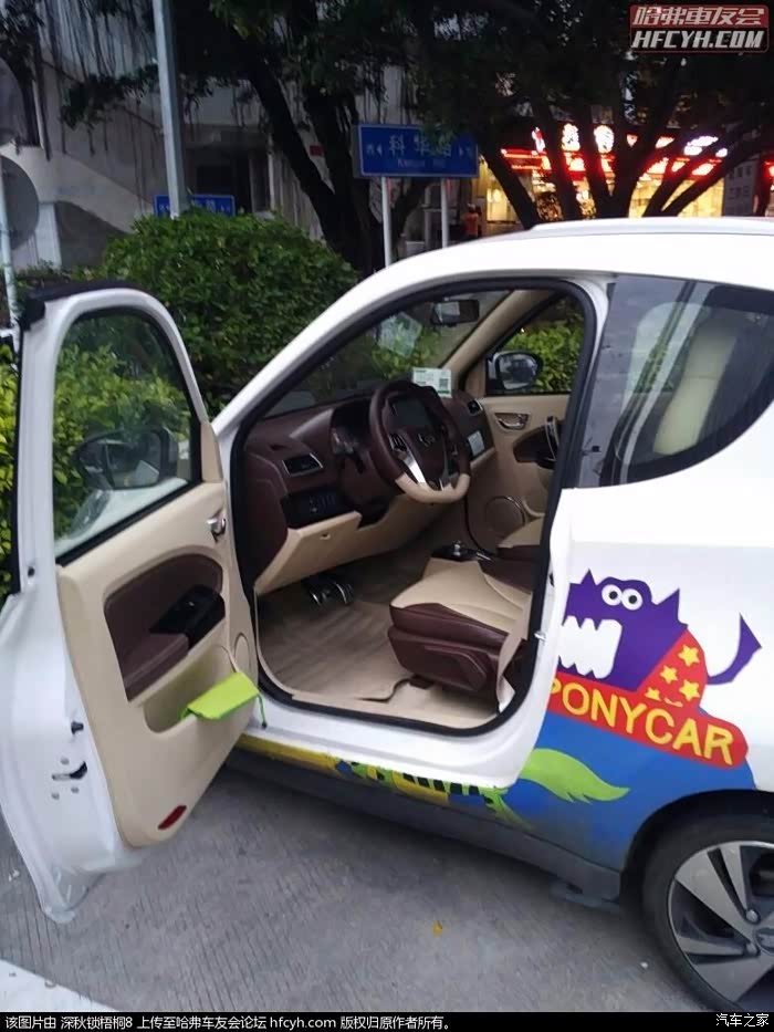 在五洲医院地面停车场停放的马上用车电动车,刚刚通过APP打开车子,开启车门,一股廉价的味道扑鼻而来