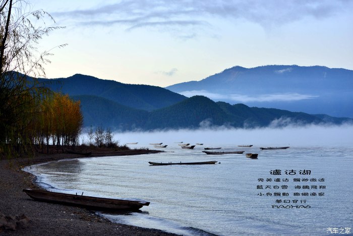 行:早上6:30起床去博瓦村拍云雾,因为天气原因,没有形成好大云雾,却在五支落村的拍到了登博瓦岛的游客, 在这里,湖畔长满芦苇草,坐在的猪槽船上,从芦苇之间划出去,很有诗意。小船在草海里慢慢驶上湖心,海鸥围着小船飞翔,太阳慢慢从山中升起……。