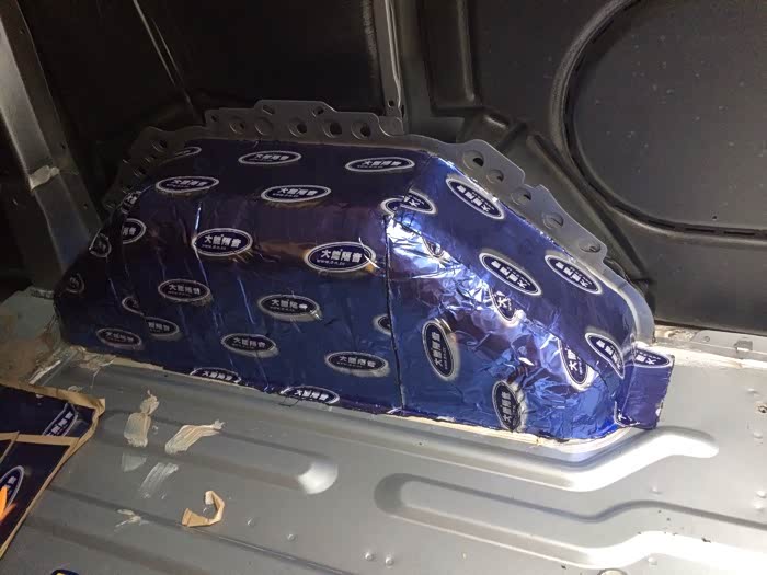 原车地板拆了、那是中密度板、上面沾着胶皮、很臭味很大、春节一次出去玩把老姐臭吐了网上买的大能止震垫和吸音垫、效果不错原先恼人的低频声总在耳朵这位置响、做了之后把他压在底下位置、这感觉很值得做、开车的环境大大改善