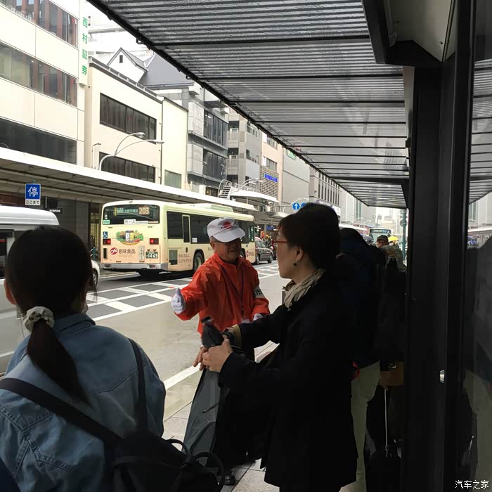 我们要坐公交车去清水寺,租和服的地方也在清水板,公交过去很方便,一趟车直接到,京都的公交站,都有穿着制服的老爷爷在服务,就是下图这样带着小白帽和白手套的老爷爷,特别热心,看到我们在看站牌,主动来问我们去哪,然后仔细的告诉我们坐几路哪里下,然后让大家排好队,一直笑呵呵的