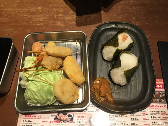 道顿堀又很多有名的餐厅,蟹道乐这些的,不过我们不打算去凑热闹啦,想吃吃看小馆子,于是就在酒店后面的小路上随便挑了家吃烤串串的店