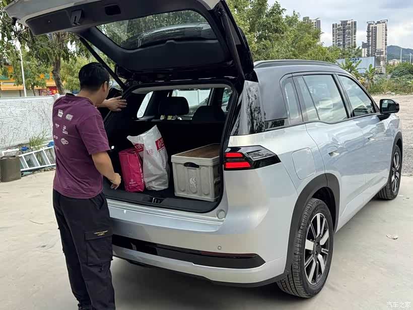 我这车是电动尾门,开关按键隐藏在下面,不过贴了个小标志指示位置,他一摸就能摸到。搁往后备厢里比了下长度,宽度其实很够了,深度一般吧,标准的紧凑级SUV的空间,他平时喜欢去钓钓鱼,鱼竿收缩之后都能放后备箱。
